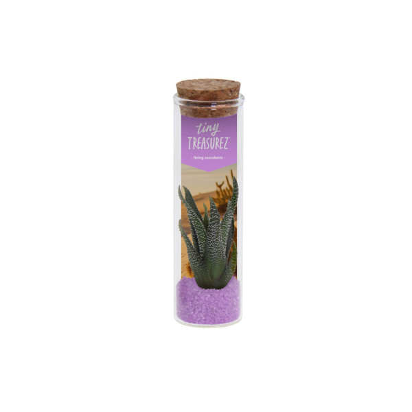 Die Tiny Treasurez® Message in a Bottle Small ist ein originelles grünes Giveaway, ideal als Werbegeschenk bei Veranstaltungen, Messen, Thementagen oder als kleines Dankeschön. In der Glasflasche befinden sich eine Schicht Sand oder farbiger Kies, eine stimmungsvolle Infokarte über die Tiny Treasurez sowie natürlich die lebende Mini-Sukkulente. Die Standardkarte kann auf Wunsch durch eine persönliche Botschaft ersetzt oder individuell gestaltet werden. Auch der Korken der Flasche kann bedruckt werden.