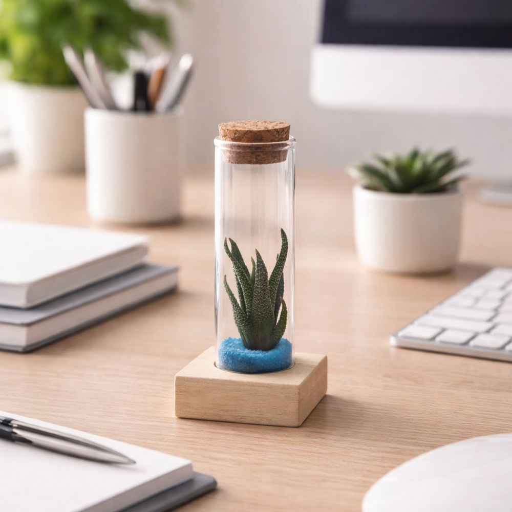 Diese Variante der Tiny Treasurez® wird in einer kleinen Glasflasche präsentiert, die auf einem Holzständer platziert ist. Die Flasche enthält lebende Mini-Sukkulenten in einer Schicht aus Sand oder farbigem Kies. Der Holzständer bietet Platz für eine Personalisierung, etwa mit einem Logo, Namen oder einer kurzen Botschaft.