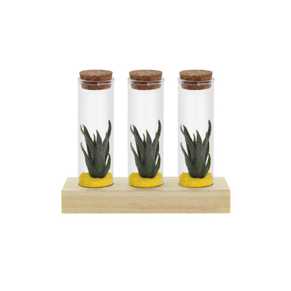 Diese hochwertige Ausführung enthält drei Glasfläschchen, die jeweils mit lebenden Mini-Sukkulenten in einer Schicht aus Sand oder farbigem Kies gefüllt sind. Die Fläschchen sind stilvoll auf einem Holzständer arrangiert, der Platz für eine Personalisierung bietet, etwa mit einem Logo, Firmennamen oder einer kurzen Botschaft.