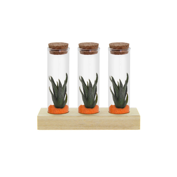 Diese hochwertige Ausführung enthält drei Glasfläschchen, die jeweils mit lebenden Mini-Sukkulenten in einer Schicht aus Sand oder farbigem Kies gefüllt sind. Die Fläschchen sind stilvoll auf einem Holzständer arrangiert, der Platz für eine Personalisierung bietet, etwa mit einem Logo, Firmennamen oder einer kurzen Botschaft.