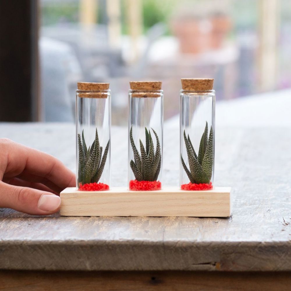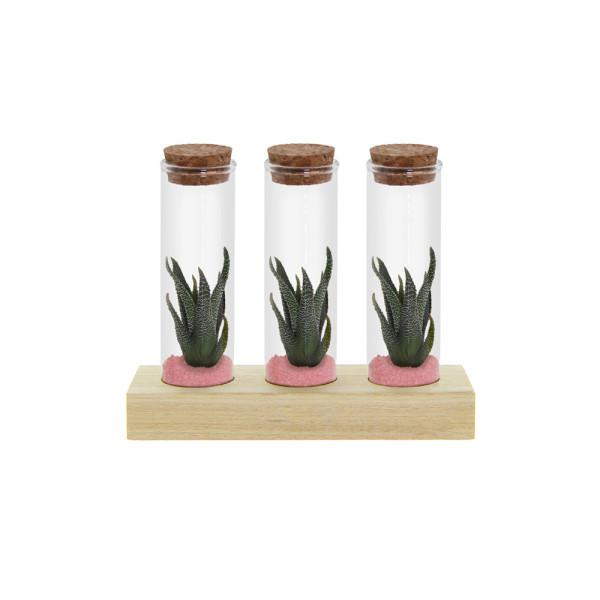 Diese hochwertige Ausführung enthält drei Glasfläschchen, die jeweils mit lebenden Mini-Sukkulenten in einer Schicht aus Sand oder farbigem Kies gefüllt sind. Die Fläschchen sind stilvoll auf einem Holzständer arrangiert, der Platz für eine Personalisierung bietet, etwa mit einem Logo, Firmennamen oder einer kurzen Botschaft.