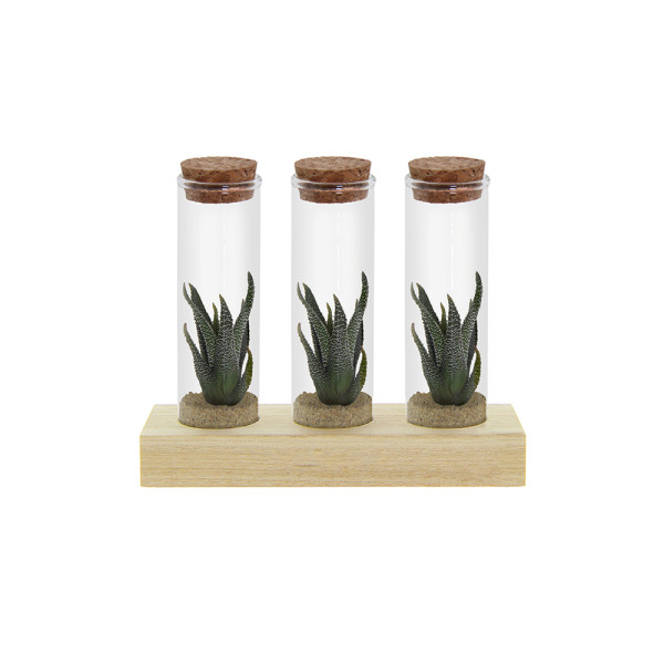 Diese hochwertige Ausführung enthält drei Glasfläschchen, die jeweils mit lebenden Mini-Sukkulenten in einer Schicht aus Sand oder farbigem Kies gefüllt sind. Die Fläschchen sind stilvoll auf einem Holzständer arrangiert, der Platz für eine Personalisierung bietet, etwa mit einem Logo, Firmennamen oder einer kurzen Botschaft.