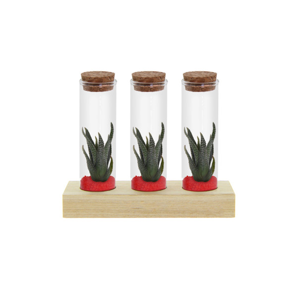 Diese hochwertige Ausführung enthält drei Glasfläschchen, die jeweils mit lebenden Mini-Sukkulenten in einer Schicht aus Sand oder farbigem Kies gefüllt sind. Die Fläschchen sind stilvoll auf einem Holzständer arrangiert, der Platz für eine Personalisierung bietet, etwa mit einem Logo, Firmennamen oder einer kurzen Botschaft.