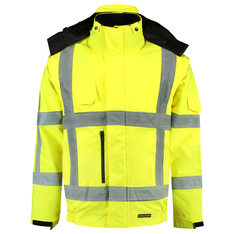 High-Visibility-Pilotenjacke gemäß der Richtlinien des Rijkswaterstaat (RWS). Die Jacke in Pilotenoptik hat eine sportliche Passform. Wind-, wasserdicht und atmungsaktiv, mit versiegelten Nähten, PU-Beschichtung und wasserabweisenden Reißverschlüssen. Hohe Sichtbarkeit nach EN ISO 20471:2013, Klasse 3, mit doppelt gesteppten Streifen. Die Jacke hat eine Kapuze, die mittels Reißverschluss abgenommen oder im Kragen verstaut werden kann. Die Ärmel können ebenfalls mit Reißverschluss abgenommen werden. Vertikale Tasche mit wasserabweisendem Reißverschluss und verschließbare Tasche fürs Handy. Mit 2-Wege-Reißverschluss vorne teilbar und und doppelter Wetterschutzleiste mit Regenrinne. Diese Pilotenjacke hat ein herausnehmbares Thermo-Futter und eine Innentasche mit kleiner Öffnung fürs Kabel und ID-Badge.