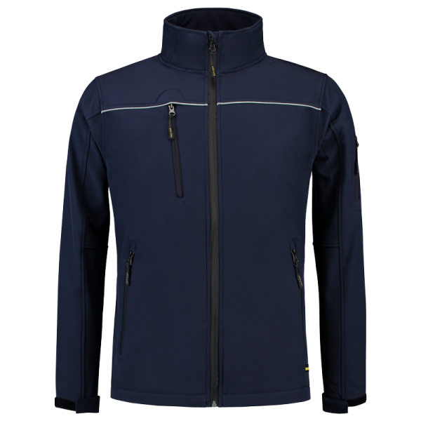 Eine Softshell zeichnet sich durch einen hohen Tragekomfort sowie wind- und wasserdichte Eigenschaften aus. Das Material besteht aus gewebtem Polyester. Die PU-Zwischenschicht sorgt für optimale Atmungsaktivität, sodass die Feuchtigkeit nach außen weitergeleitet und dem Schwitzen in der Jacke entgegen gewirkt wird. Das dehnbare Gewebe garantiert eine gute Bewegungsfreiheit. Die Softshelljacke hat einen Stretch-Anteil für optimalen Tragekomfort. Die Reflexbiesen auf der Brust gewährleisten eine gute Sichtbarkeit. Der Bund ist durch eine elastische Kordel mit Stoppern und die Ärmelbündchen mit Klett verstellbar. Die Softshelljacke hat an der Vorderseite 4 Taschen und bietet daher viel Stauraum. Zur Vermeidung des Durchsatzes mit Farbe empfehlen wir, lediglich Drucktechniken zu nutzen, die für Softshellstoffe geeignet sind.