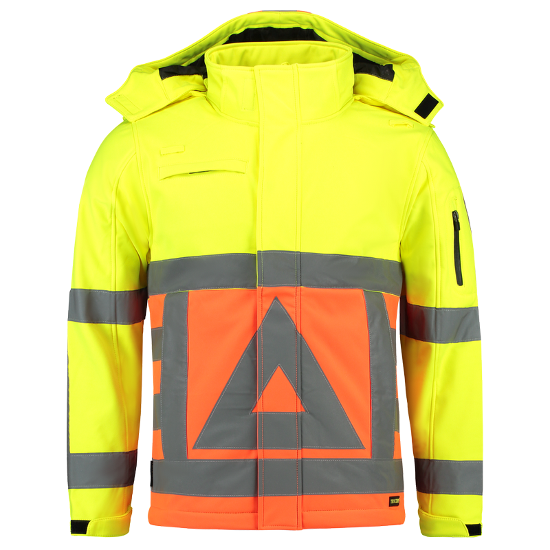 Diese zweifarbige Softshelljacke mit hoher Sichtbarkeit ist aus atmungsaktivem und wasserabweisendem Material gefertigt. Die dicht gewebten Schichten bieten einen hervorragenden Wind- und Wetterschutz, weichen Griff und hohen Tragekomfort. Winddicht und wasserabweisend. Mit ID-Kartenhalter und abnehmbarer Kapuze. Der Bund ist durch einen Gummizug mit Stoppern verstellbar. Mit Schulterklappen und verstellbaren Manschetten mit Klettband. Hohe Sichtbarkeit nach EN ISO 20471:2013, Klasse 3, mit genähten Streifen. Diese Jacke hat eine Schlaufe fürs Funkgerät, eine Brustschlaufe, 2 Taschen für Telefon, kleine Öffnung für Kabel und ID-Kartenhalter. Diese Softshelljacke erfüllt alle Anforderungen und Vorschriften gemäß Regeling Verkeersregelaars 2009 (Regelung für Verkehrsregler). Zur Vermeidung des Durchsatzes mit Farbe empfehlen wir, lediglich Drucktechniken zu nutzen, die für Softshellstoffe geeignet sind.