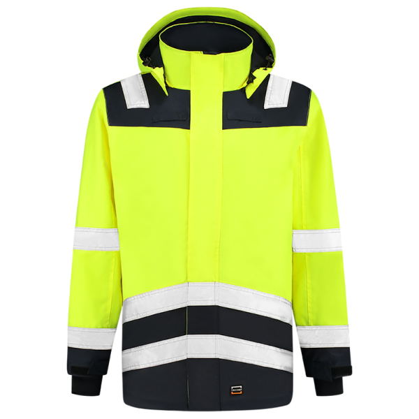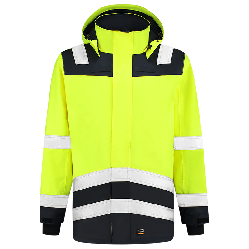 Der Warnschutz Parka Bicolor ist Teil der Tricorp 20/20 Vision-Kollektion und ist nach EN ISO 20471:2013 Klasse 2 zertifiziert. Dadurch ist der Träger bei Tag und Nacht sichtbar und geschützt. Neben verbesserter Sichtbarkeit bietet diese Jacke dank der EN 343 Klasse 3/3-Zertifizierung auch Schutz gegen Niederschlag (Regen, Schnee), Nebel und Feuchtigkeit. Die Jacke hat einen abnehmbare Kapuze. Die vielen Taschen bieten reichlich Stauraum. Durch den Druckerreißverschluss kann der Parka optimal veredelt werden. Beim Bücken bleibt der Rücken durch ein verlängertes Rückenteil geschützt. Die Jersey-Bündchen mit Daumenöffnung bieten zusätzlichen Schutz und halten die Hände warm. Der Saum des Parkas kann mittels Tunnelzug individuell verstellt werden.