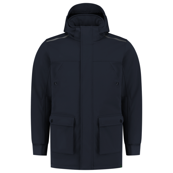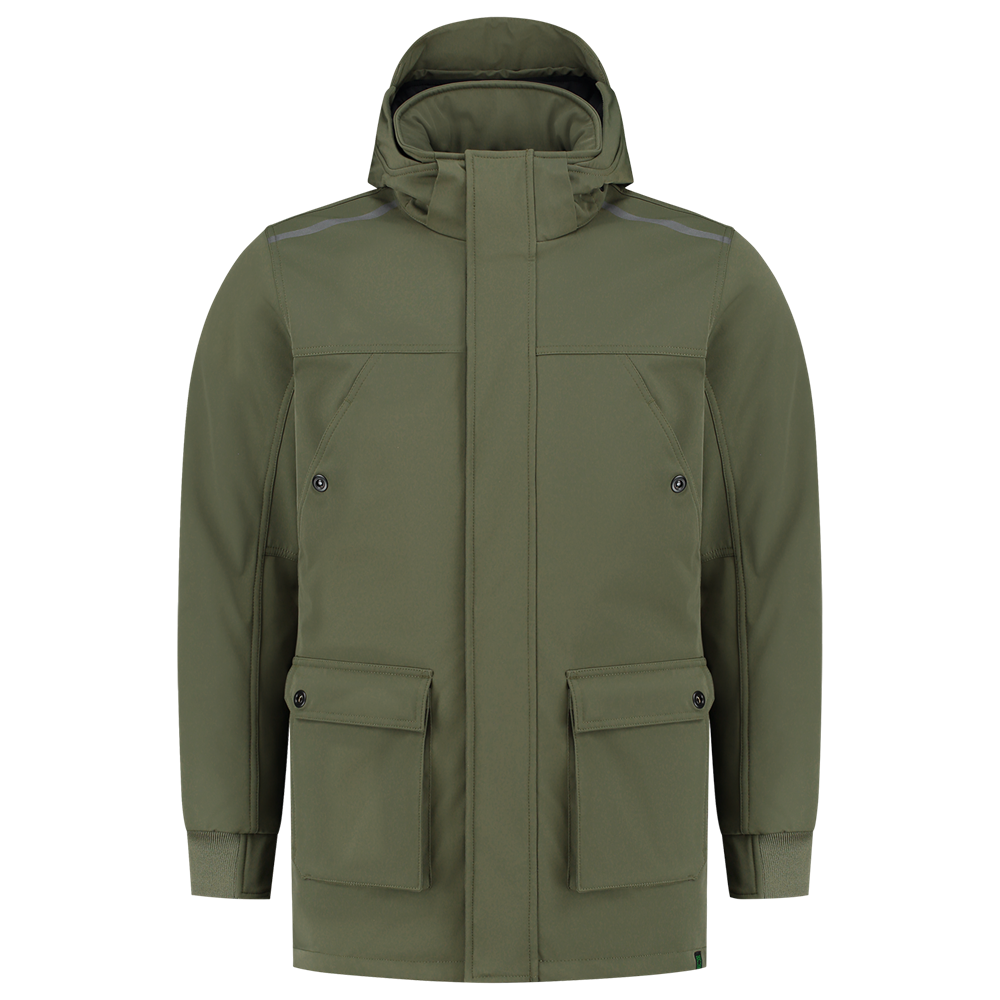 Lernen Sie diesen modernen Winterparka in der beliebten Softshell-Qualität kennen. Teil der Rewear-Kollektion, d.h. die Jacke ist aus recycelten Materialien hergestellt! Der Name Parka weist bereits auf das Modell der Jacke hin: Sie fällt bis über die Hüften. Dadurch entsteht ein sehr lässiger und moderner Look. Die Brusttaschen haben einen schrägen Eingriff und können mit einem Druckknopf verschlossen werden. Ideal, um die Hände darin schön warm zu halten! Es gibt viele Taschen, in denen Sie all Ihre praktischen Arbeitsutensilien verstauen können: Taschen auf der Vorderseite mit seitlichen und oberen Eingriffen, zwei Innentaschen und zwei mit Druckknöpfen verschließbare Brusttaschen. Der Reißverschluss ist mit einer Sturmklappe abgedeckt, die mit verdeckten Druckknöpfen geschlossen wird. Die Kapuze hat eine seitliche Aussparung für zusätzliche Sicht und ist mittels Druckknöpfen vollständig abnehmbar. Um im Dunkeln besonders gut sichtbar zu sein, sind die Schultern, die Kapuze und das Rückenteil mit einem reflektierenden Print versehen. Es gibt auch einen Drucker-Reißverschluss, so dass Sie die Jacke leicht bedrucken können.