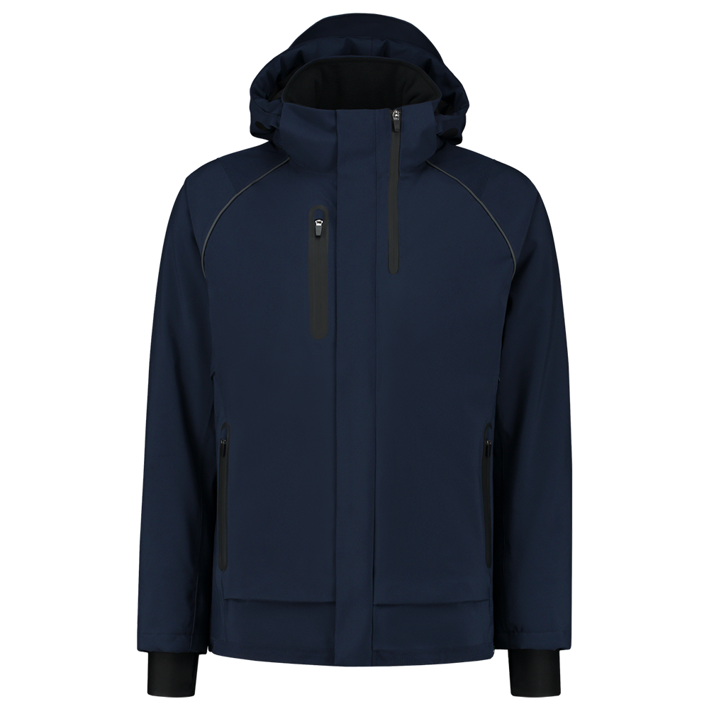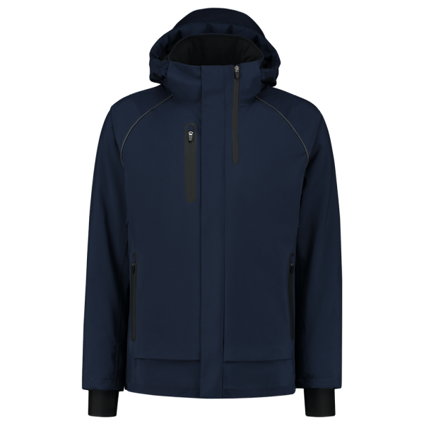 Die reflektierenden Paspel-Elemente verleihen der Arbeitsjacke einen sportlichen und modernen Look und machen den Träger besonders gut sichtbar. Die Winter Tech Shell ist mit einem Drucker-Reißverschluss an der Unterseite des Rückenteils ausgestattet. Der Schulterbereich und der Saum sind mit einem verstärkten Kontraststoff versehen. Die Halsöffnung der Jacke ist mit einem Reißverschluss verstellbar, sodass auch ein Schal oder Rollkragenpulli problemlos getragen werden kann. Die Kapuze ist abnehmbar und mit einem verdeckte Kordelstopper versehen.