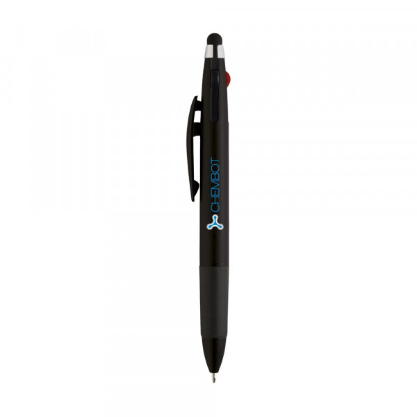 3-farbiger Kugelschreiber mit Gummispitze zum Bedienen von Touchscreens (wie iPhone/iPad), Gehäuse in Metalloptik, silberne Akzente und Gummivorderteil. Mit blauer, roter und schwarzer Tinte.