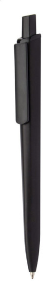 Kunststoff-Kugelschreiber mit matter Metallic-Oberfläche und schwarzen Elementen, blauschreibend.