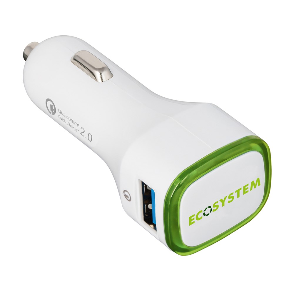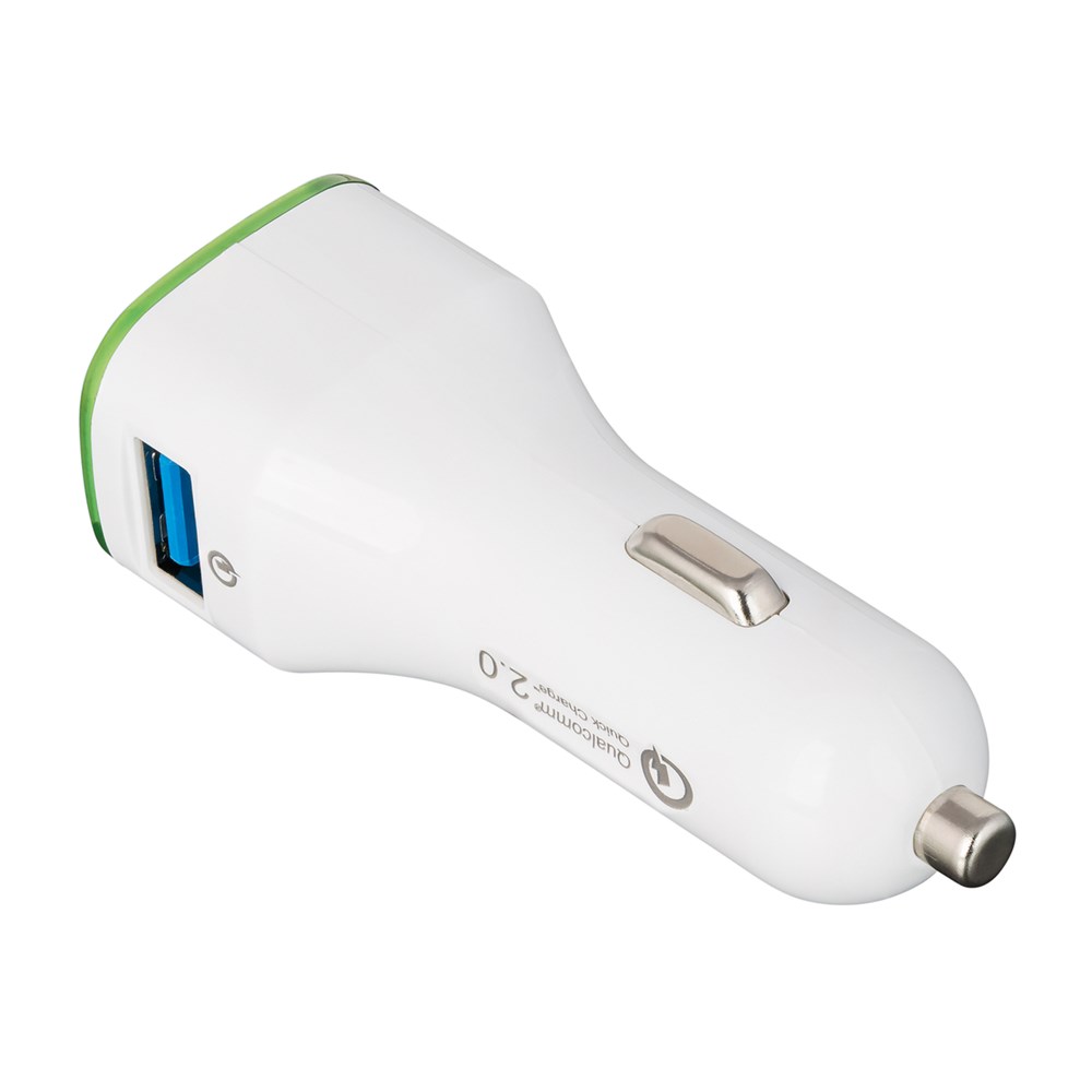 Dieser Quick charge 2.0-Autoladeadapter hilft, wenn der Akku unterwegs schnell aufgeladen werden muss. Voraussetzung: Ihr Handy ist schnellaufladefähig! Wenn nicht, lädt der Adapter Ihr Gerät dennoch in Standardgeschwindigkeit auf. Output bei zwei Ausgängen - Standardausgang USB DC 5V/1,6A und Quick charge 2.0 mit bis zu DC 5V/2,4A; DC9V/1,7A; DC 12V/1,2 A in Abhängigkeit vom zu ladenden Gerät. Das integrierte Schutzsystem bewahrt vor Überspannung, Überhitzung und Kurzschluss. Der umlaufende Farbring an der Werbefläche wird per LED hinterleuchtet.