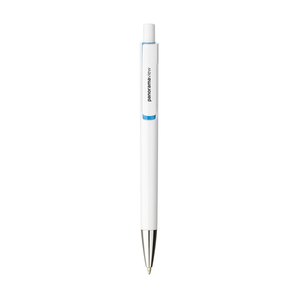 Blauschreibender Kugelschreiber mit einem Gehäuse aus recyceltem ABS. Mit einzigartigem Design: das Gehäuse und der Clip von diesem Kugelschreiber sind aus 'einem Guss', was diesen Kugelschreiber zu einem besonderen Blickfang macht. Mit auffallendem Farbakzent unter dem GRS-zertifiziert.