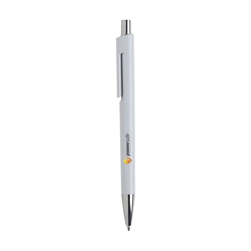 Blauschreibender Kugelschreiber mit einzigartigem Design: das Gehäuse und der Clip von diesem Kugelschreiber sind in einem Stück geformt und das macht diesen Kugelschreiber zu einem besonderen Blickfang. Mit auffallendem silbernen Akzent unter dem optisch 'schwebenden' Clip.