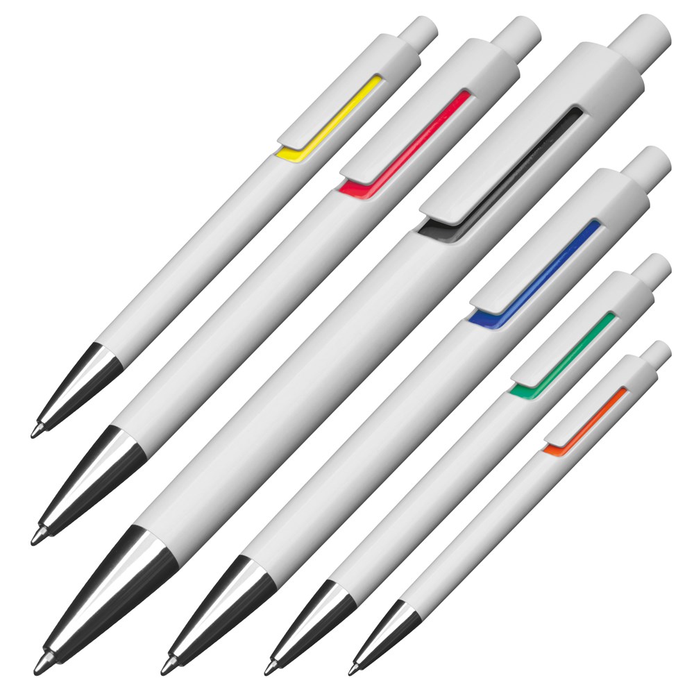 Unser Kugelschreiber mit weißem Schaft, farbigen Applikationen, blau schreibender Großraummine und extravagantem Clip bietet ein auffälliges und dennoch praktisches Schreibgerät. Ihre Werbung wird auf den Schaft des Kugelschreibers gedruckt, um sicherzustellen, dass Ihre Marke auf auffällige und stilvolle Weise präsentiert wird.