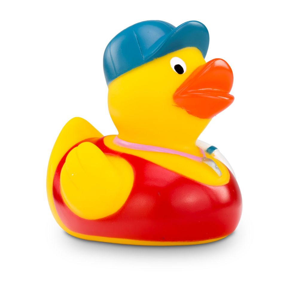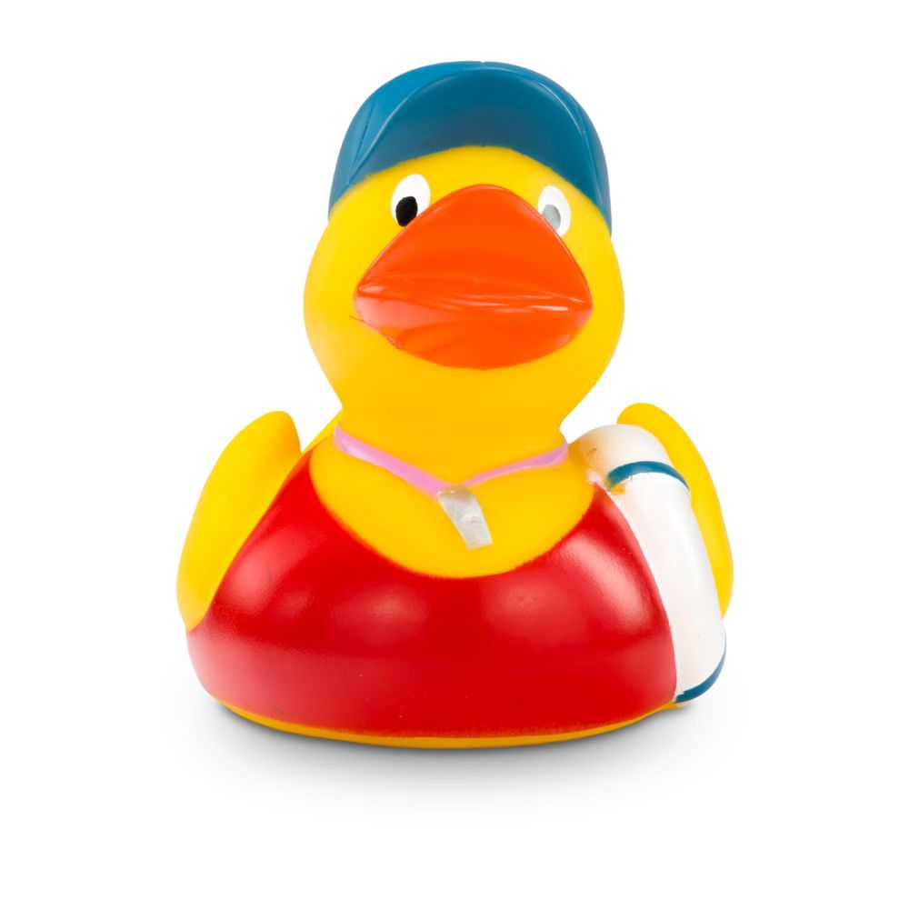 Benny Bademeister sorgt für Sicherheit am Entenstrand. Wenn eine Ente zu tief ins gefährliche Gewässer schwimmt, ist er mit Rettungsreifen und Trillerpfeife zur Stelle. Schnell wirft er den Schwimmreifen aus, und eilt zur Rettung. Größe: ca. 8 cm. Inklusive Quietschventil