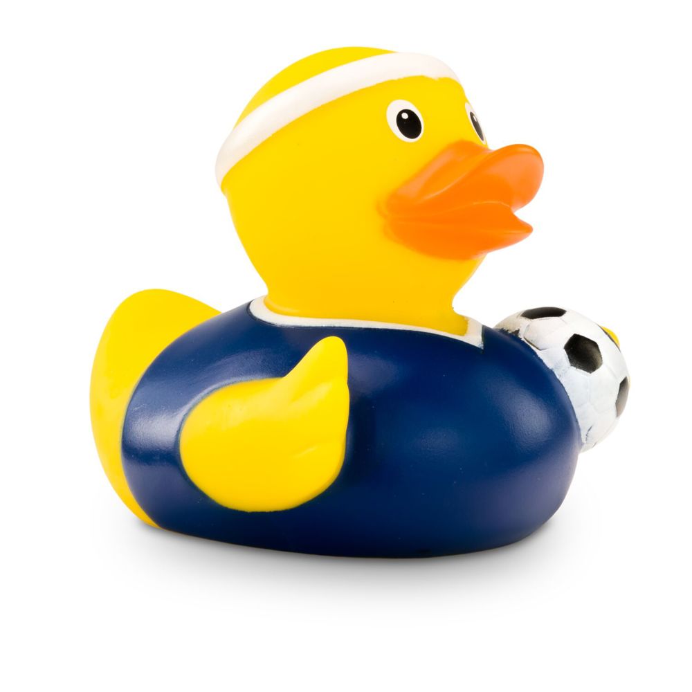 Fritz Freistoß ist der gefürchtetste Stürmer in der Enten-Fußballliga! In seinem blauen Trikot, dem Stirnband auf dem Kopf und mit Ball unter dem Arm macht er sich gerade bereit für den nächsten Strafstoß. Als Profi-Fußballer bringt er Stadion-Feeling in die Badewanne. Größe: ca. 8 cm. Inklusive Quietschventil