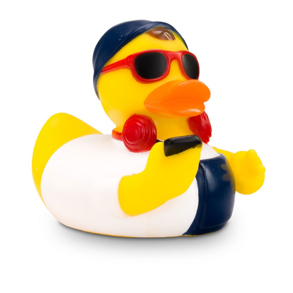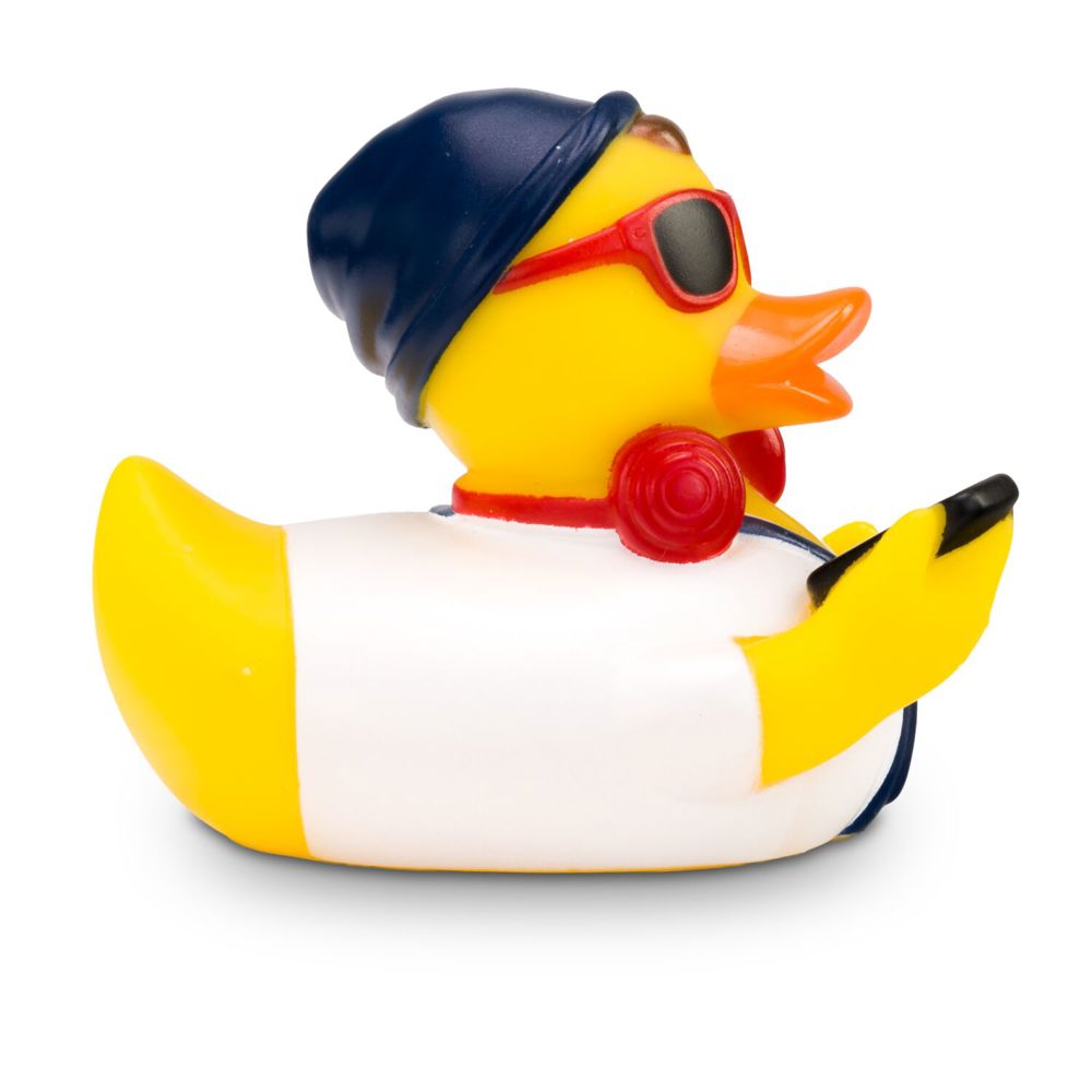 Werbeente Hannes Hipster ist modern unterwegs. Er trägt ein weißes Shirt mit blauer Latzhose und passender Mütze in blau. Um seinen Hals trägt er rote Kopfhörer, auf der Nase eine rote Sonnenbrille und im Flügel ein brandneues Smartphone. Größe: ca. 8 cm. Inklusive Quietschventil