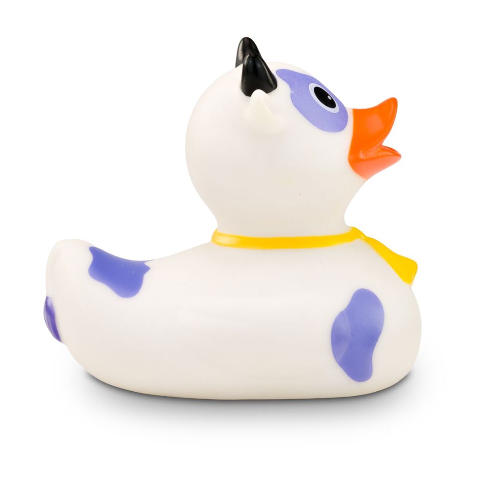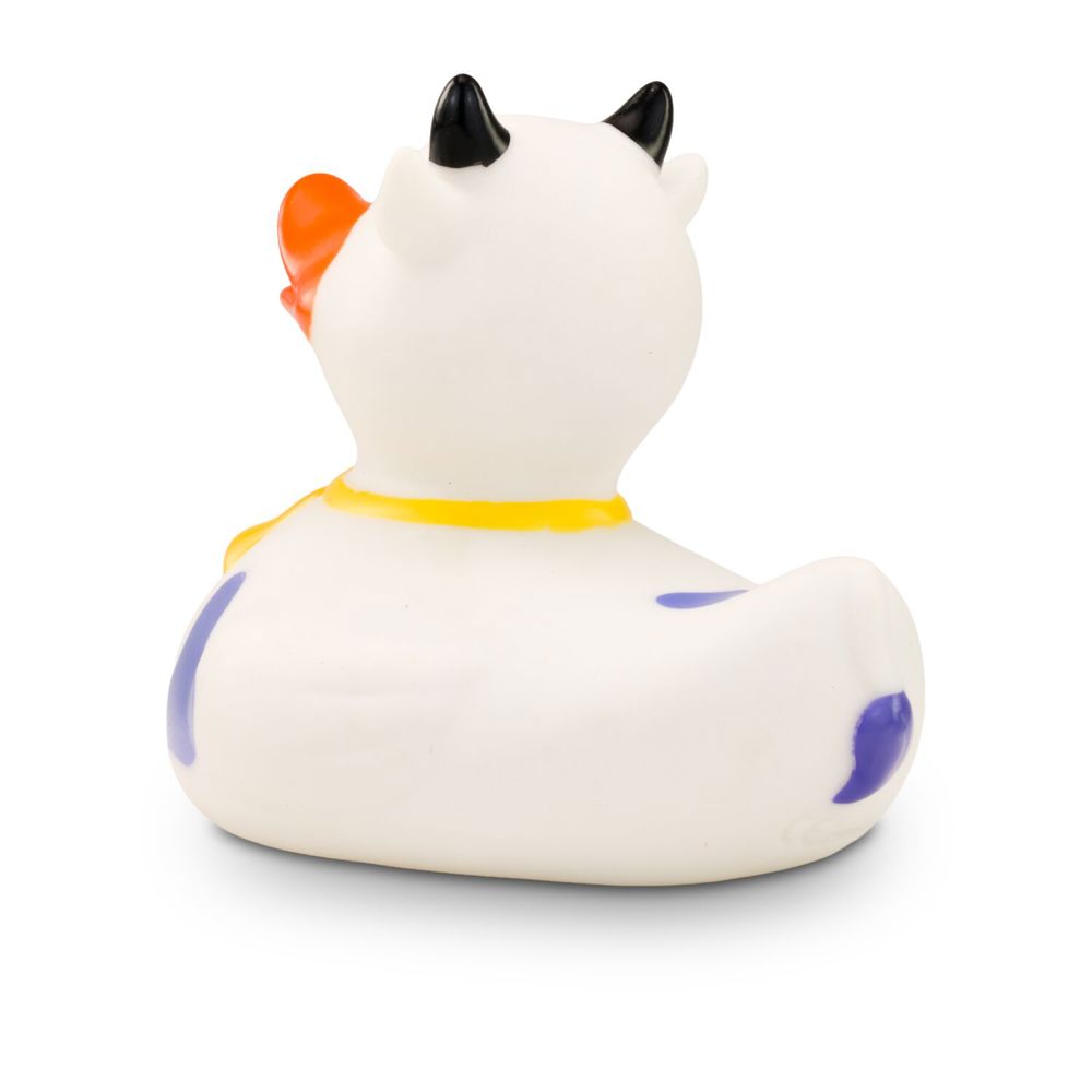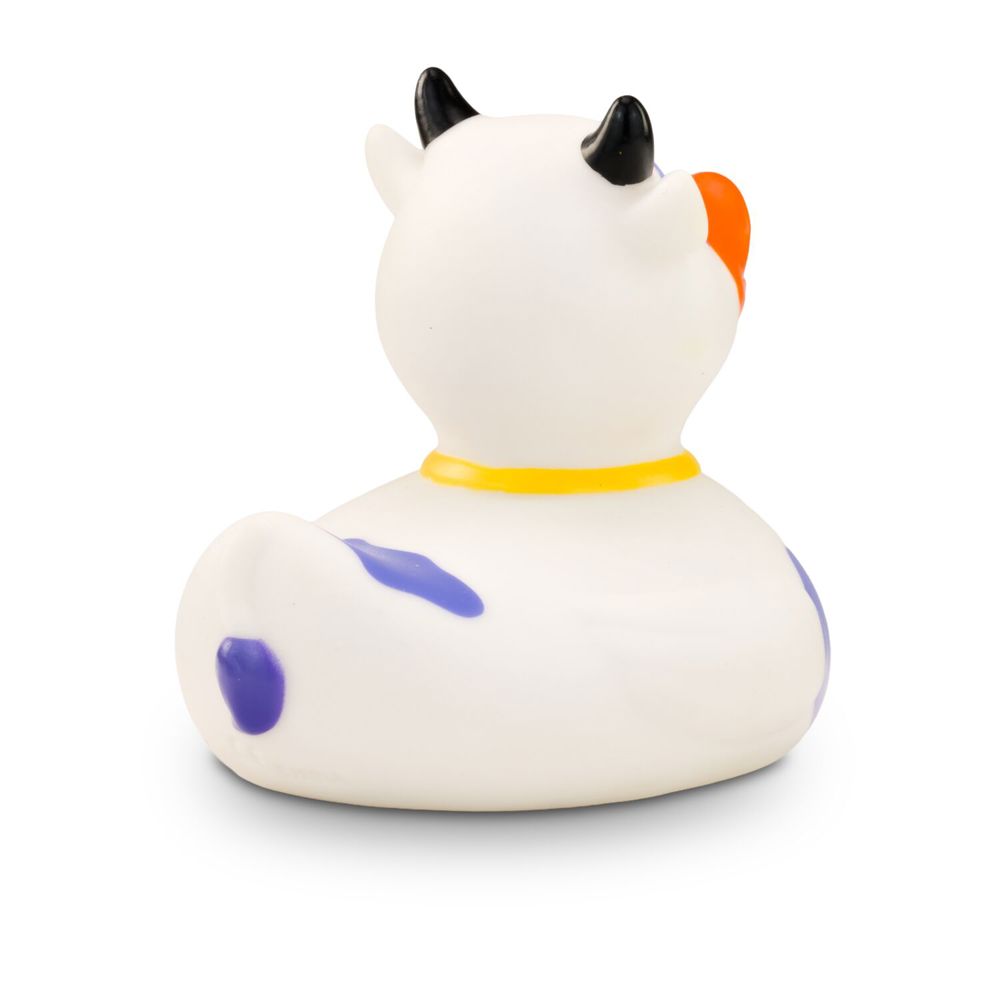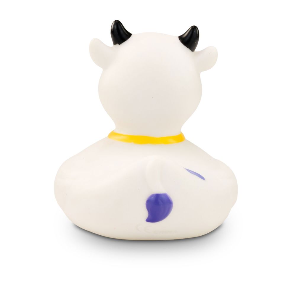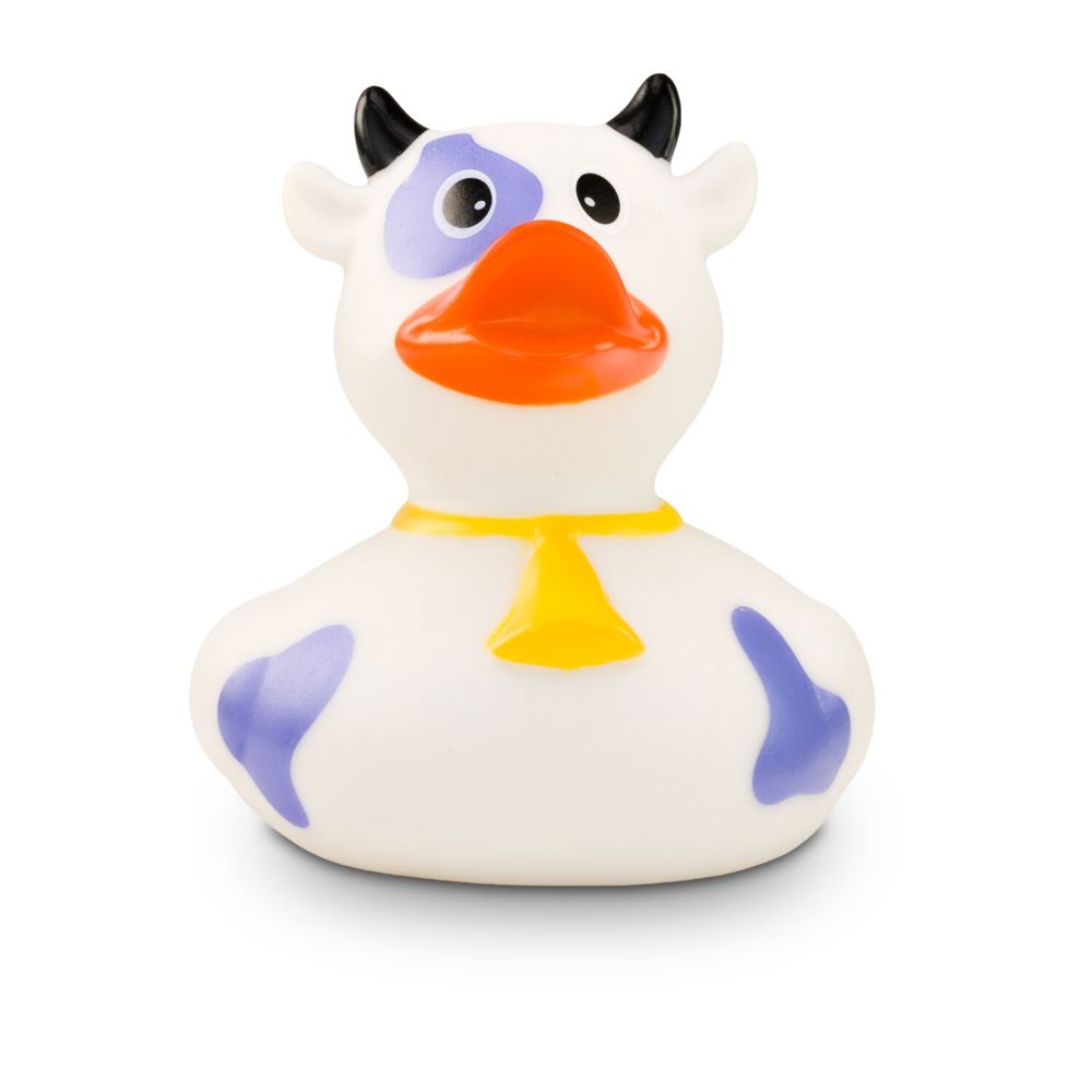 MUHH! Warum denn immer nur Badeenten in der Badewanne? Hier kommt Karla Kuh als Quietschetier. Ihr weißer Körper ist mit lila Flecken versehen. Die schwarzen Hörner und die goldene Glocke um den Hals machen ihren Kuh-Look perfekt. Größe: ca. 8 cm. Inklusive Quietschventil