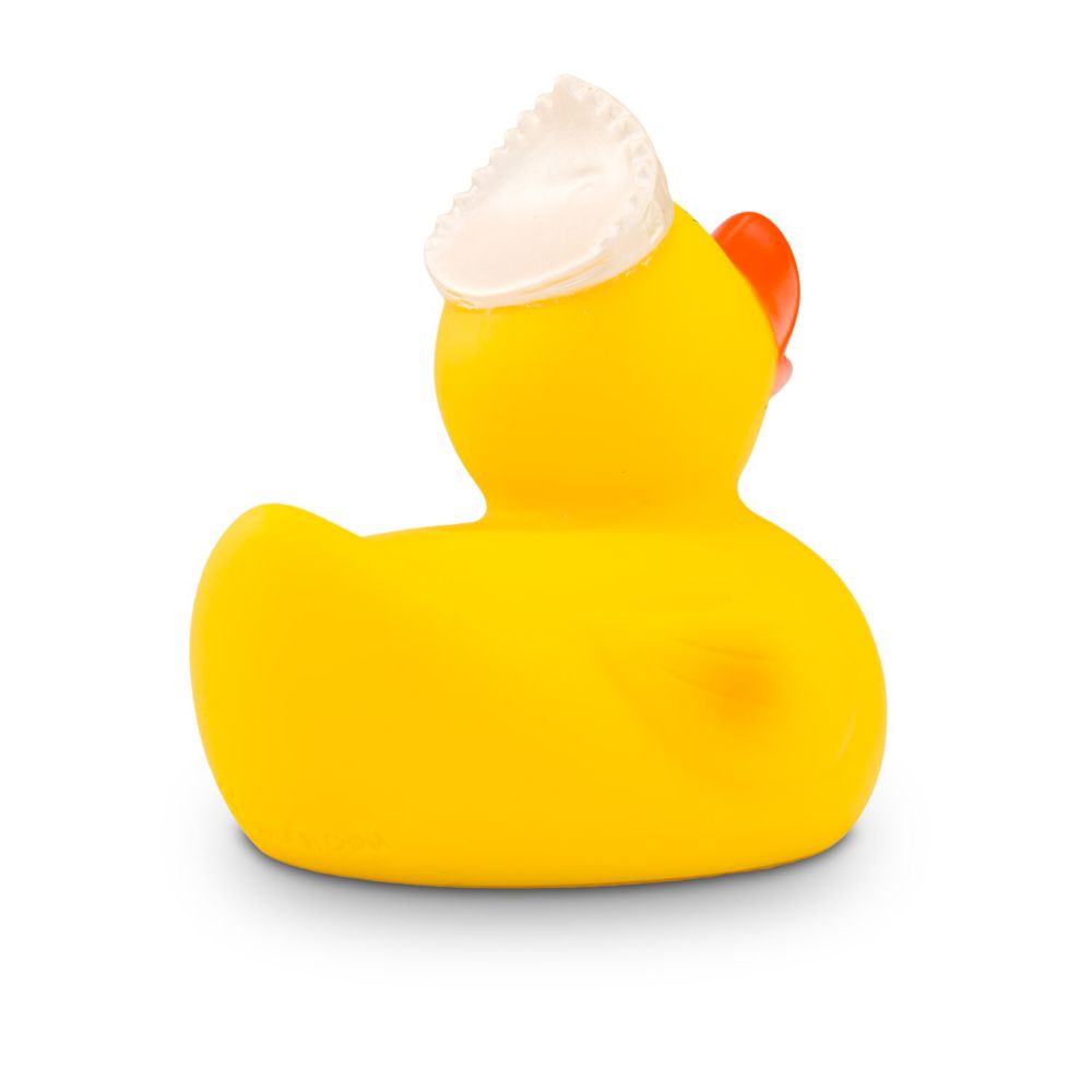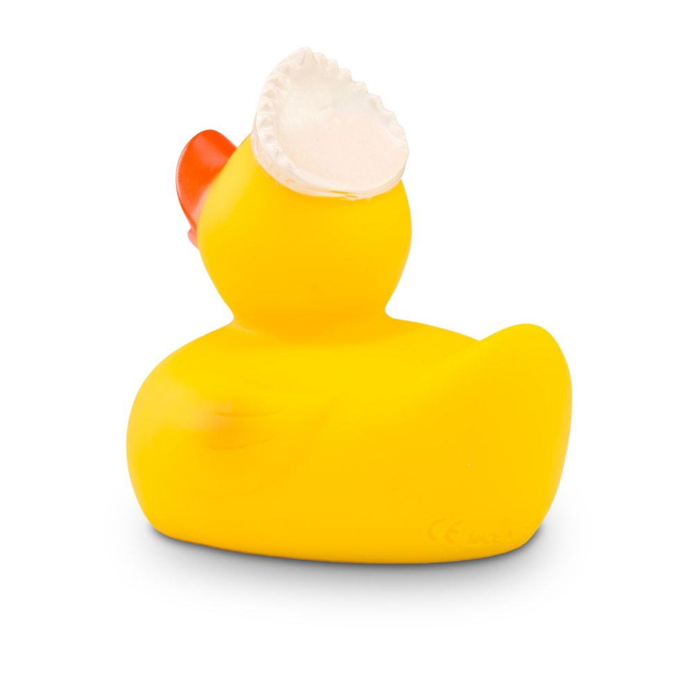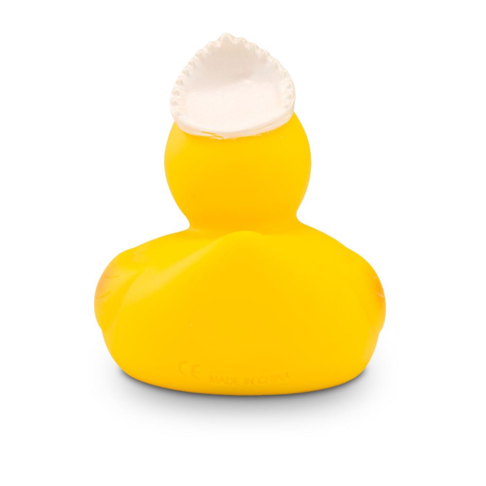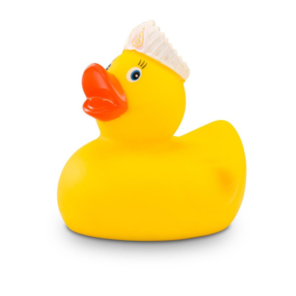 Verbeugt euch vor der Königin Quak. Sie ist eine Ente entsprungen aus einem Märchen und auf der Suche nach dem dazugehörigen König. Sie trägt eine goldene Krone auf dem Kopf und lässt mit langen Wimpern ihren Charme spielen. Größe: ca. 8 cm. Inklusive Quietschventil