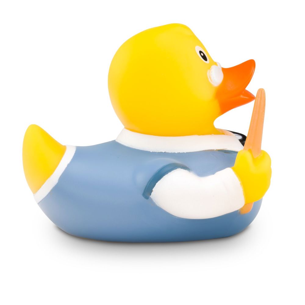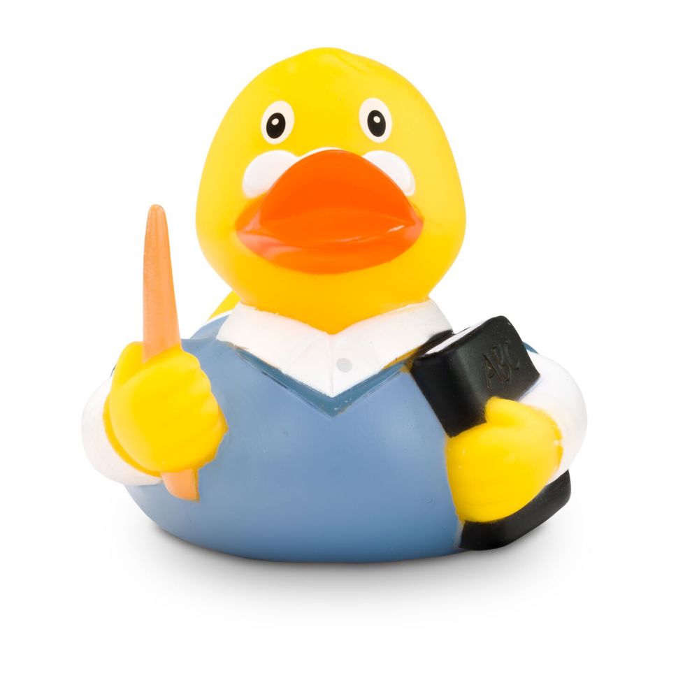 Leo Lehrer ist der Lieblingslehrer aller Kinder in der Enten-Schule. Klassisch mit Brille, blauem Oberteil, weißem Hemdkragen, Lehrbuch und Zeigestock sieht er sehr streng aus. Dabei gibt er den Entenkindern mit viel Charme und Geduld das Wissen seiner Generation über den Ententeich weiter. Größe: ca. 8 cm. Inklusive Quietschventil