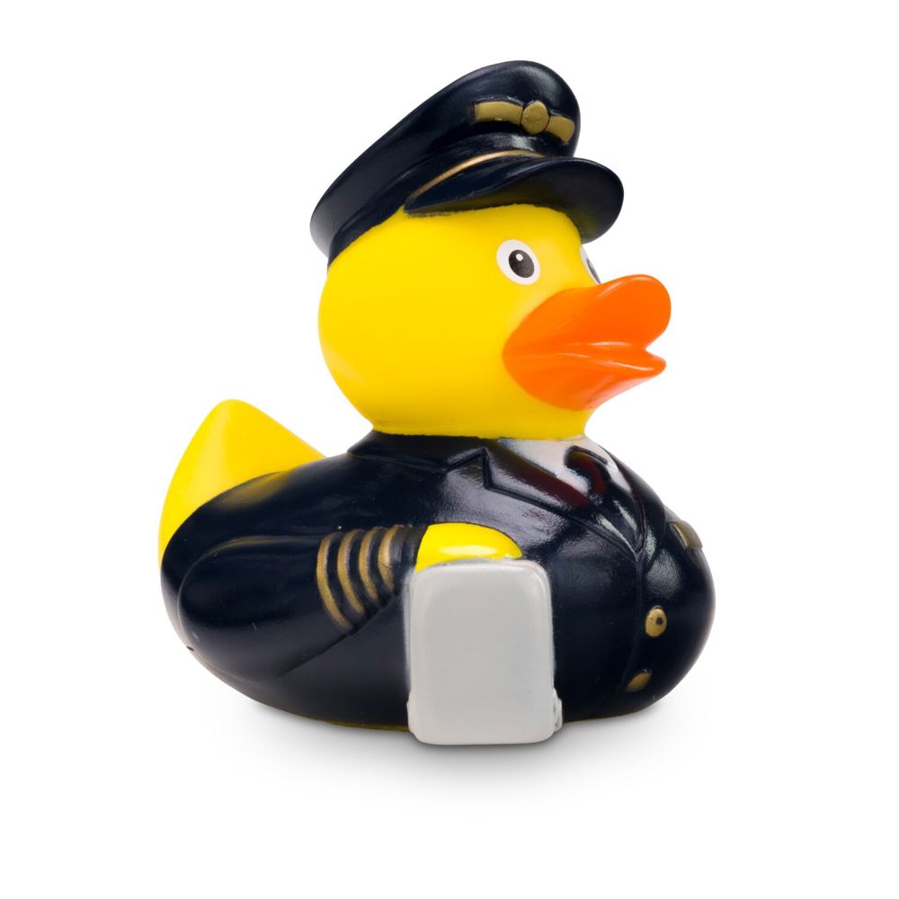 Wer träumt nicht vom Fliegen? Als Chefbadeente trägt Pepe Pilot eine klassische, dunkelblaue Piloten-Uniform mit Krawatte und passender Mütze mit Fliegersymbol und zeigt damit, wer an Bord das Kommando hat. Der kleine Koffer in seinem rechten Flügel macht die Quietschente zum perfekten Geschenk für Vielflieger, Flugzeugfans oder als Giveaway für Airlines und Reiseveranstalter. Größe: ca. 8 cm. Inklusive Quietschventil