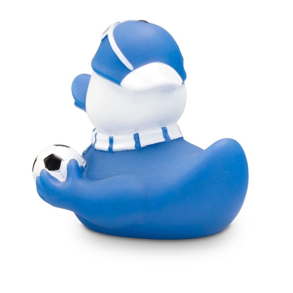 TOOOR! Sandro Stadion ist begeisterter Fußball-Fan und hat sich für den Stadion-Besuch in Schale geworfen. Er trägt einen Fanschal in seinen Lieblingsfarben Weiß und Blau und eine blaue Mütze mit weißer Sonnenbrille darauf. Unter dem Flügel hält er einen Fußball griffbereit. Größe: ca. 8 cm. Inklusive Quietschventil