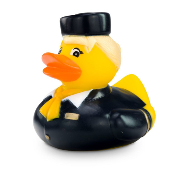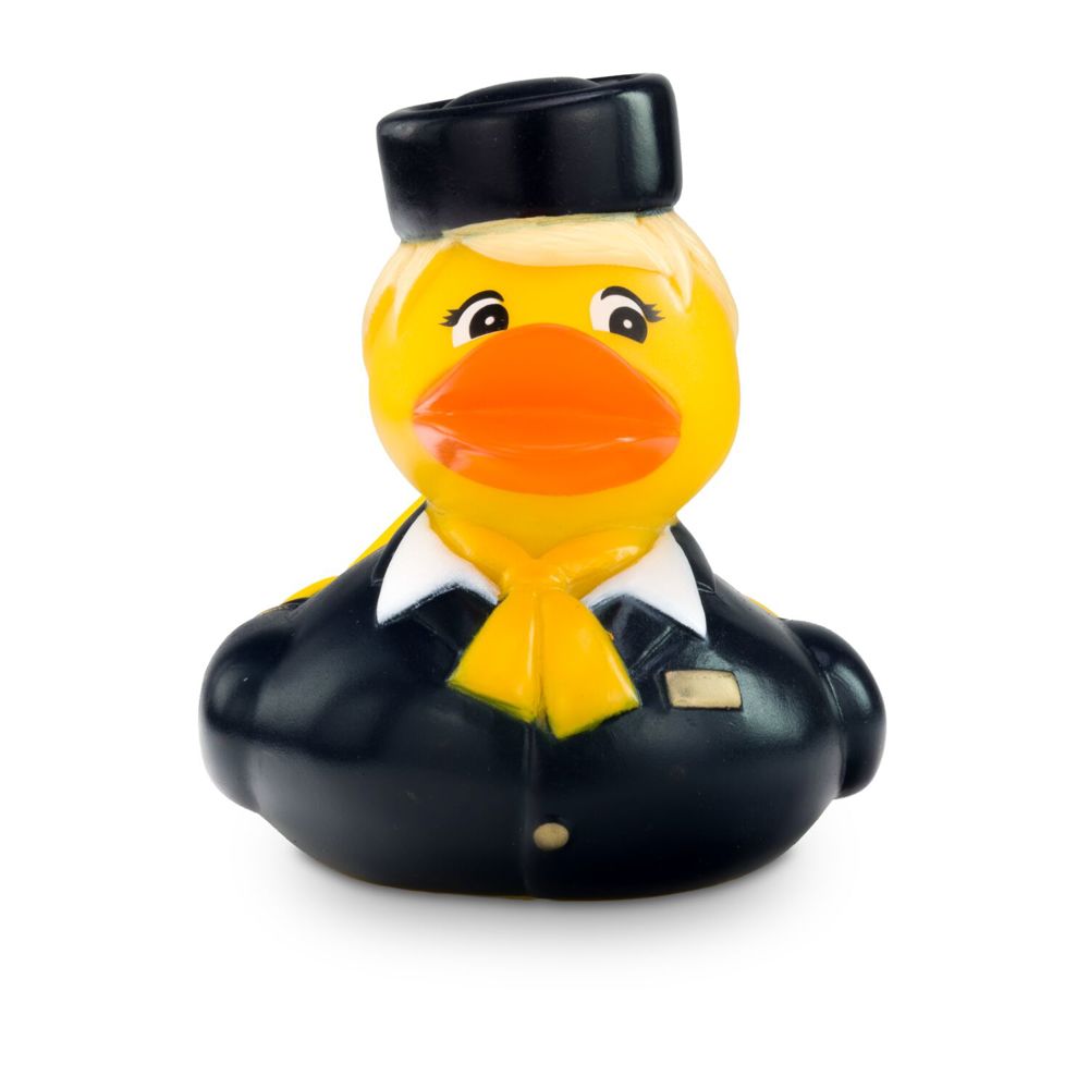 Die charmante Flugbegleiterin Steffi Stewardess begleitet sie auf ihre Reise in die Badewanne. Mit blauer Uniform, weißer Bluse, gelbem Halstuch und keckem Hütchen ist Steffie ein echter Blickfang. Goldene Streifen an den Manschetten und das goldfarbene Namensschild runden ihren eleganten und authentischen Look ab. Die perfekte Quietscheente für Vielflieger, Airlines oder als origineller Werbeartikel für Reiseunternehmen. Tipp: Steffi gibt es auch mit rotem Halstuch. Größe: ca. 8 cm. Inklusive Quietschventil