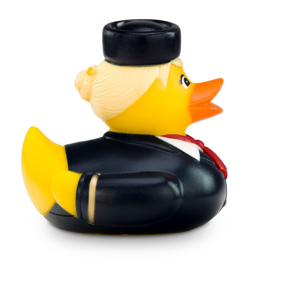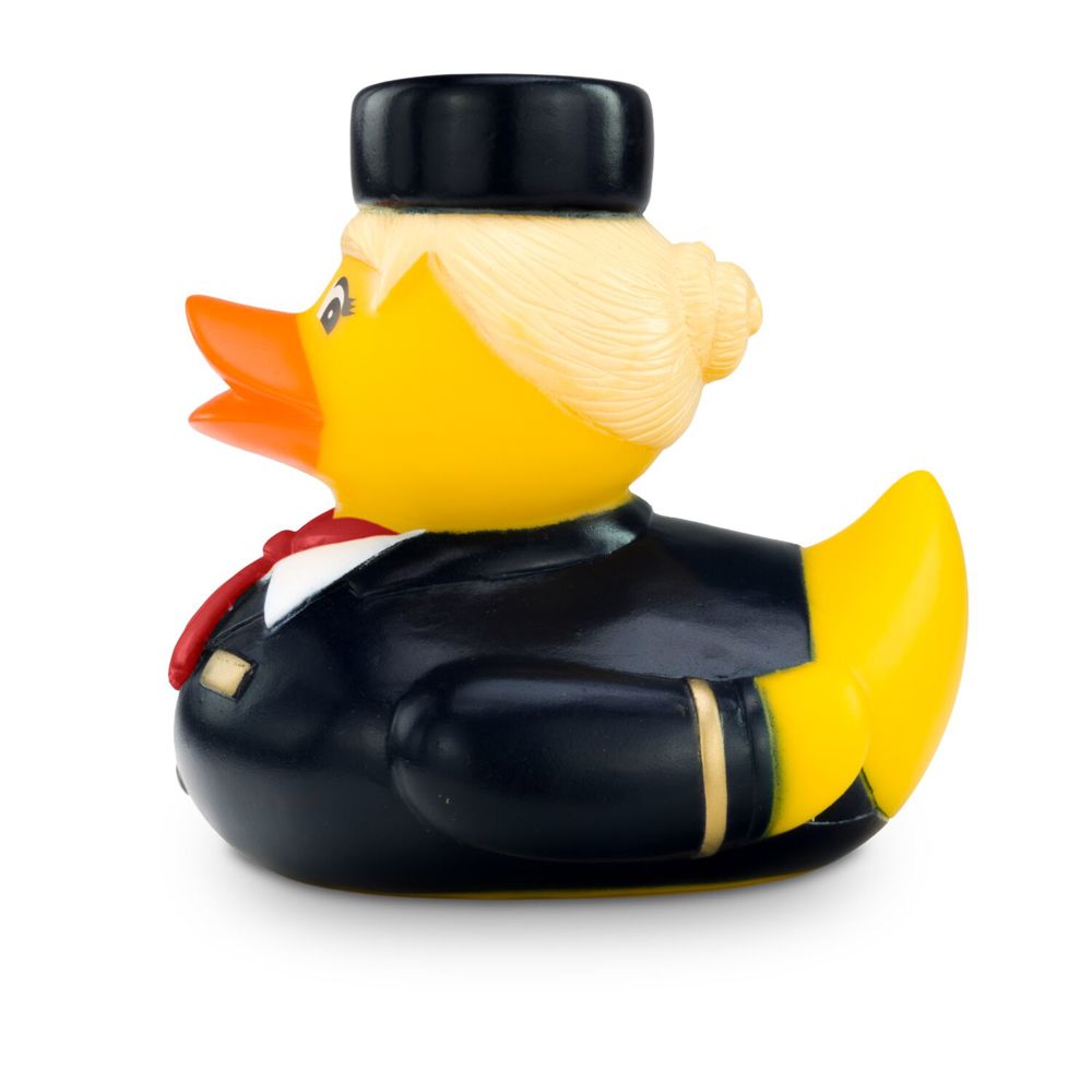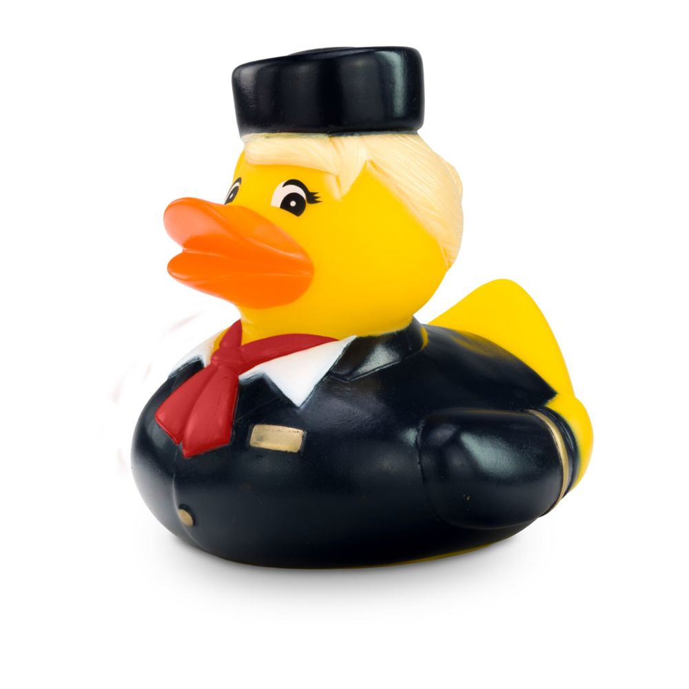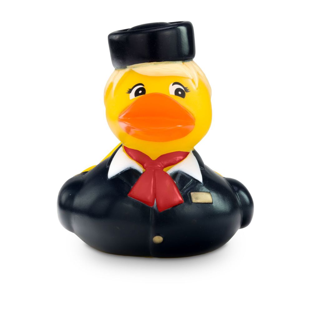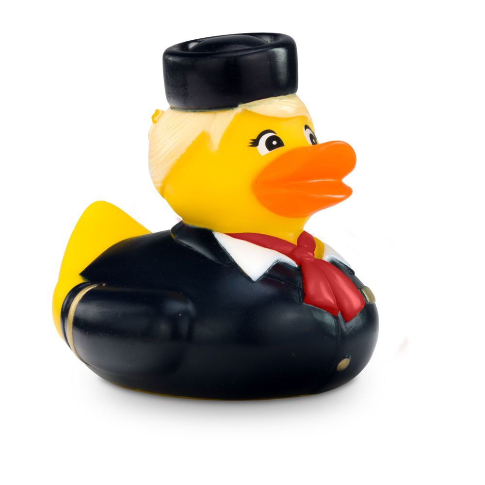 Die charmante Flugbegleiterin Steffi Stewardess begleitet sie auf ihre Reise in die Badewanne. Mit blauer Uniform, weißer Bluse, rotem Halstuch und keckem Hütchen ist Steffie ein echter Blickfang. Goldene Streifen an den Manschetten und das goldfarbene Namensschild runden ihren eleganten und authentischen Look ab. Die perfekte Quietscheente für Vielflieger, Airlines oder als origineller Werbeartikel für Reiseunternehmen. Tipp: Steffi gibt es auch mit gelbem Halstuch. Größe: ca. 8 cm. Inklusive Quietschventil
