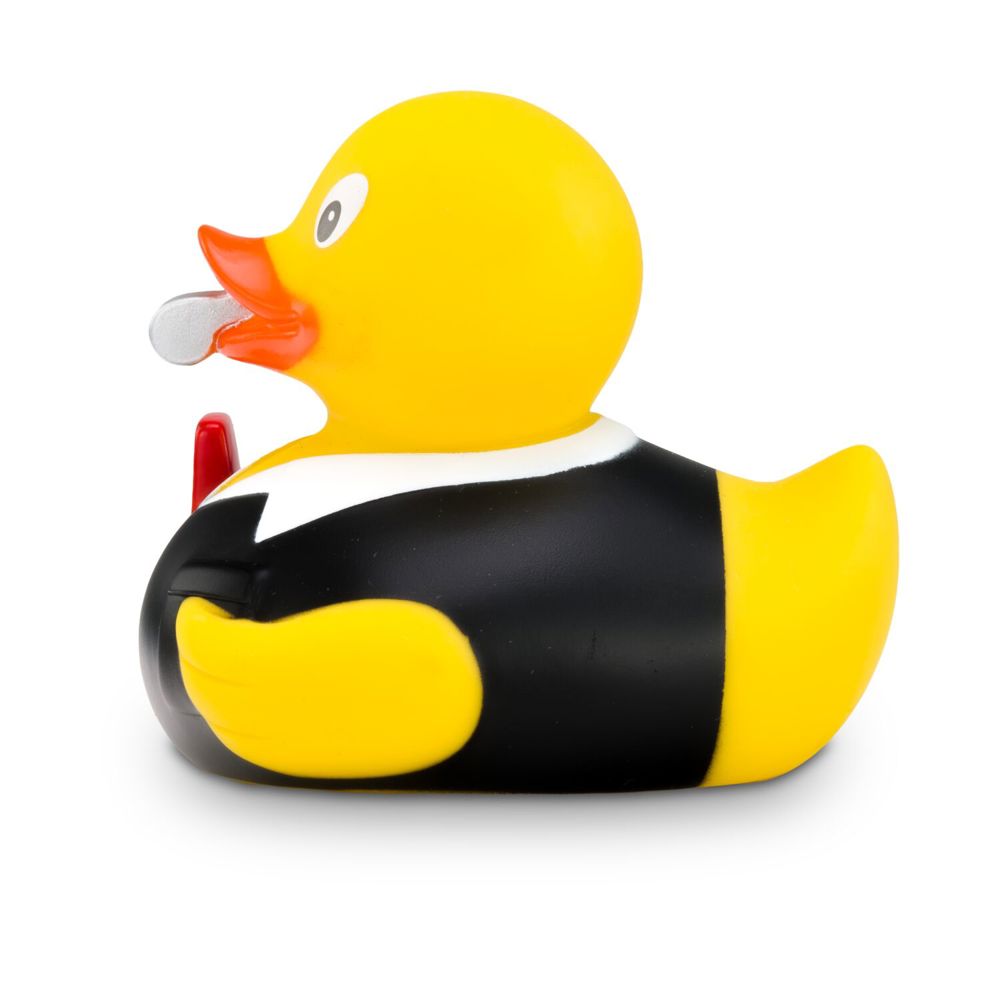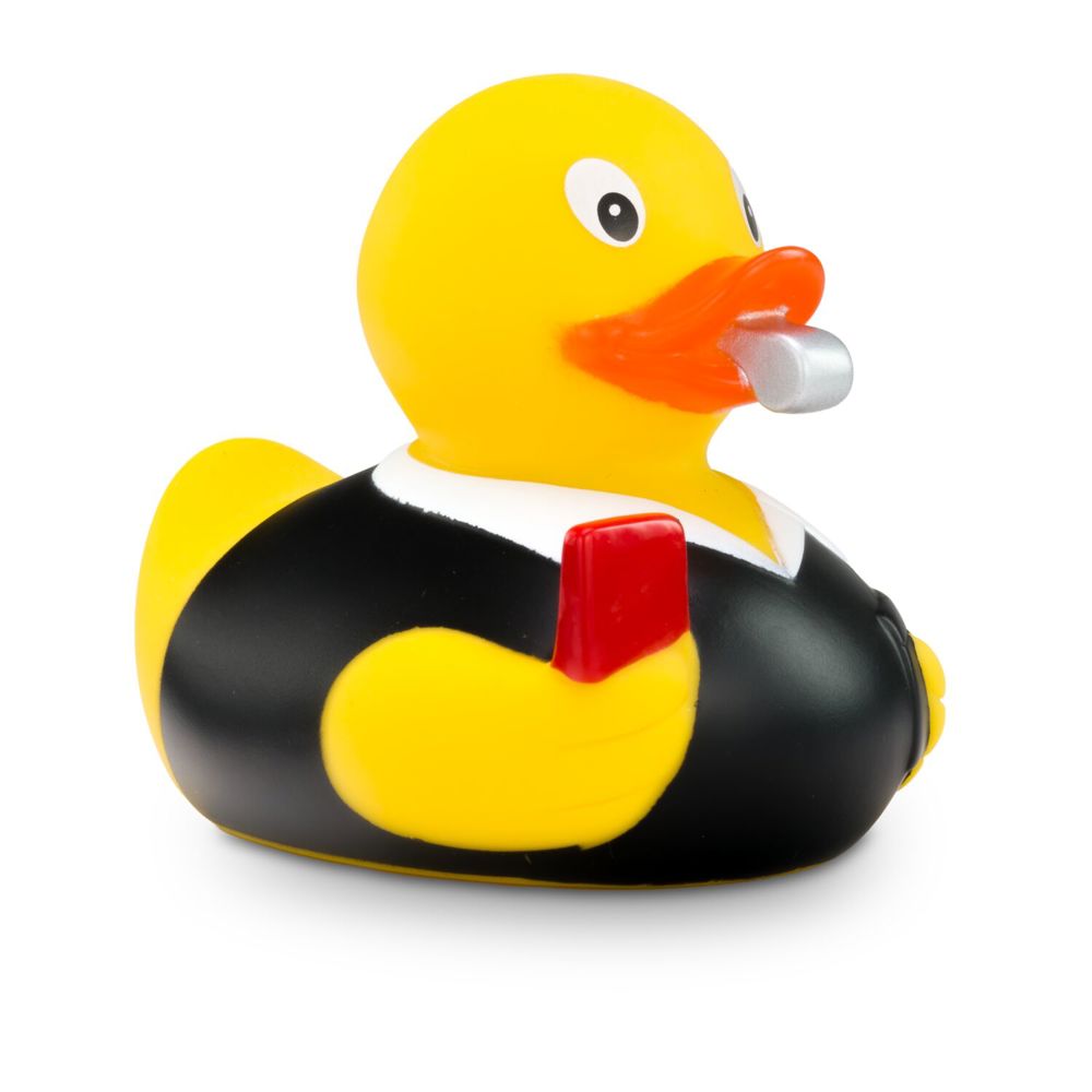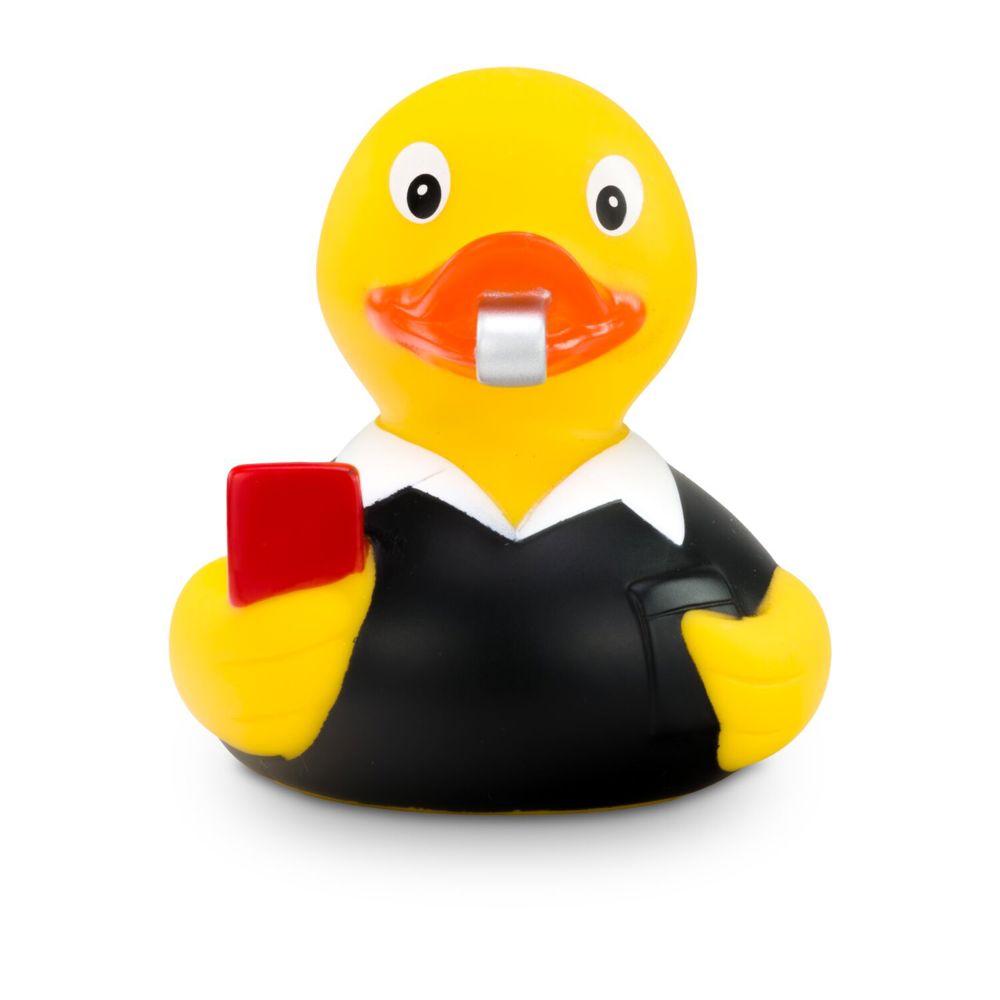 Achtung, Abpfiff! Sven Schiri ist der unbestechliche Spielleiter. Mit seinem schwarzen Trikot, der roten Karte in der Hand und der Trillerpfeife im Schnabel sorgt der Schiedsrichter für Fairplay bei Sportarten wie Fußball, Handball oder Hockey. Größe: ca. 8 cm. Inklusive Quietschventil