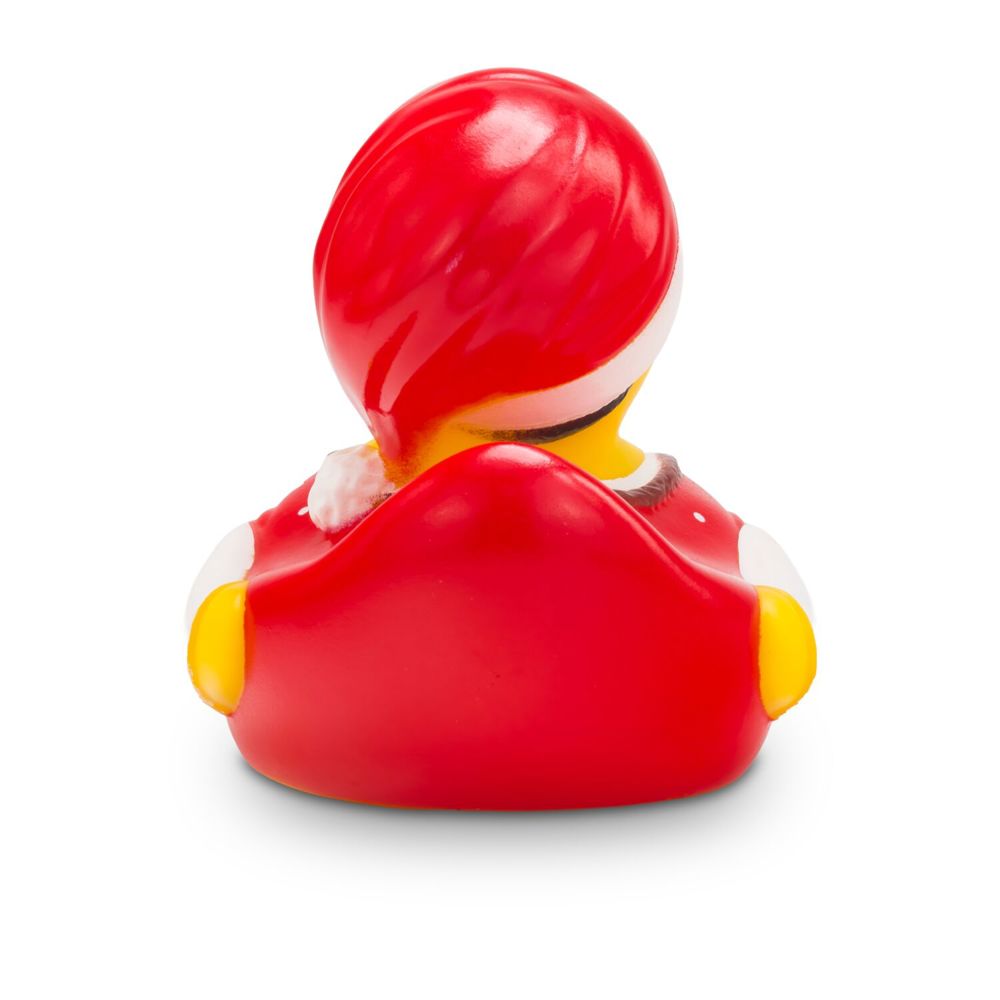 Theresa Trachtenherz lebt für die alpenländischen Trachtenfeste - selbst an Weihnachten. Sie trägt eine traditionelle rote Tracht mit weißen Punkten und eine Schürze in Dunkelgrün, dazu eine weiße Trachtenbluse mit Puffärmeln und eine weihnachtliche Zipfelmütze. Die perfekte Ente, um auch an Weihnachten an bayerische, tiroler oder südtiroler Volksfeste zu erinnern! Größe: ca. 8 cm. Inklusive Quietschventil