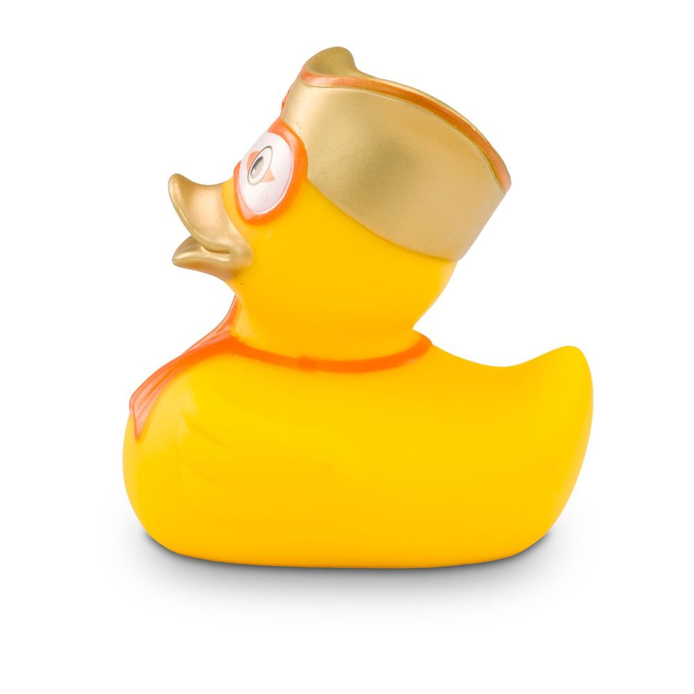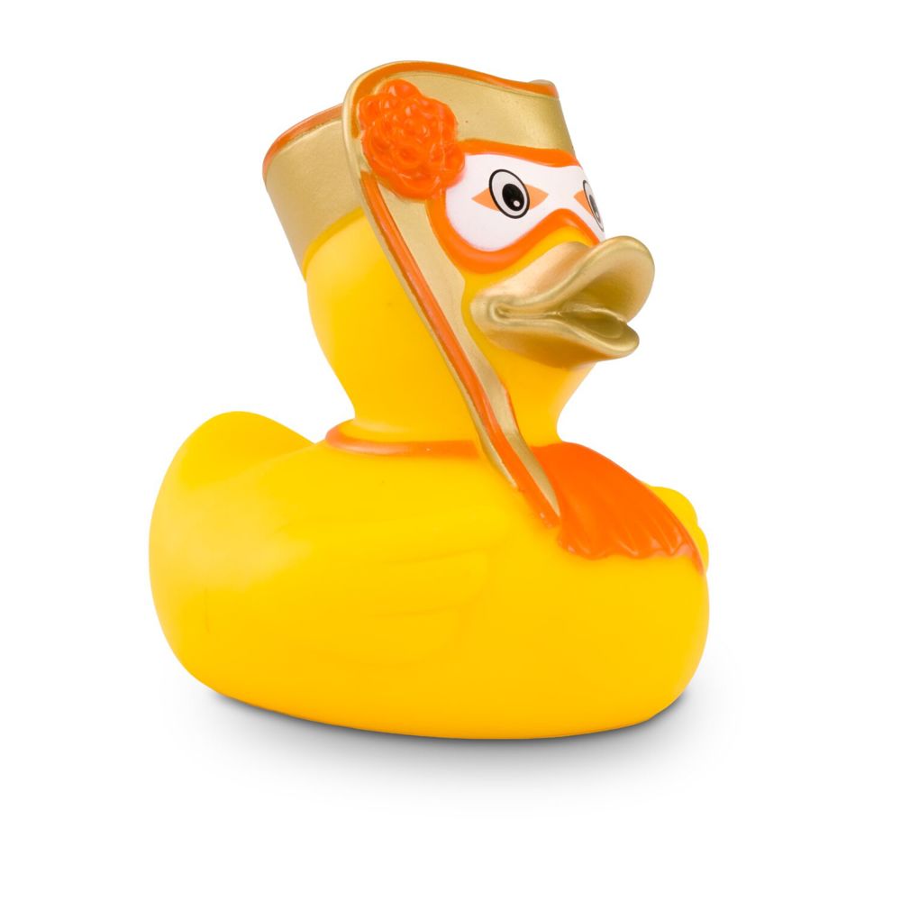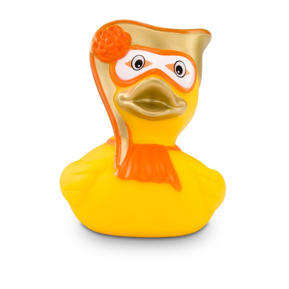 Vicky Venedig liebt den venezianischen Maskenball. Mit ihrer weißgoldenen, geschwungenen Gesichts- und Kopfmaske und einer auffälligen Blume in Orange wird Marie zum Star jeder Badewanne. Das passende orangefarbene Halstuch rundet den edlen Maskenball-Look perfekt ab. Größe: ca. 8 cm. Inklusive Quietschventil