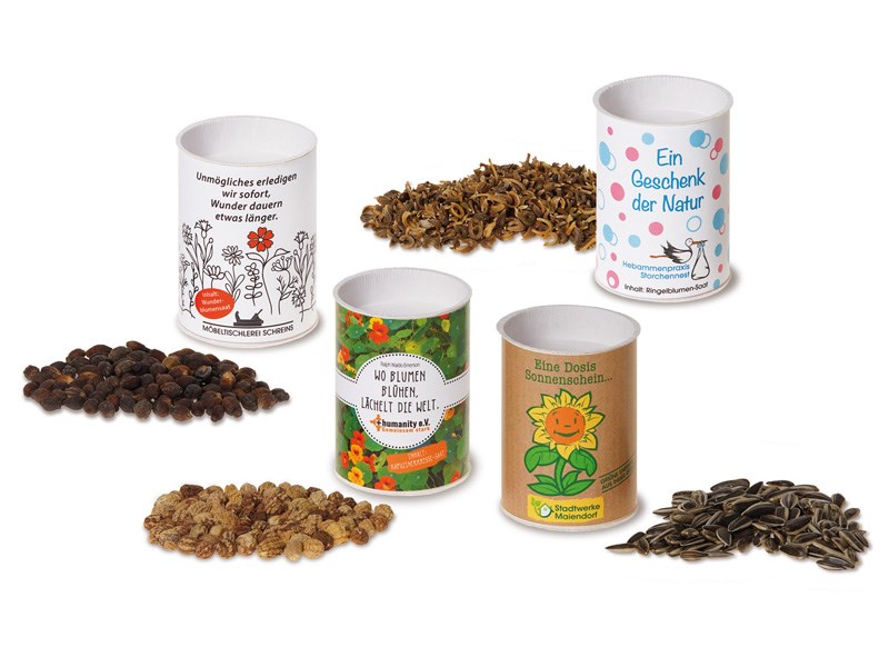 Anders als bei Samentütchen können wir die Samen-Werbetrommeln mit deutlich mehr Samen füllen. Die dreidimensionale Samen-Werbetrommel mit Ihrer Werbung hat eine ansprechende Haptik und ein kleines, handliches Format, das in jede Jackentasche passt. *** INDIVIDUELLE GESTALTUNG DER UMLAUFENDEN WERBEFLÄCHE MÖGLICH. Die gewünschte Saatsorte können Sie frei wählen. Saatsorten: Kapuzinerkresse, Ringelblume, Gelbe Sonnenblume, Rote Sonnenblume oder Wunderblume (individuelle Saatanfragen möglich)