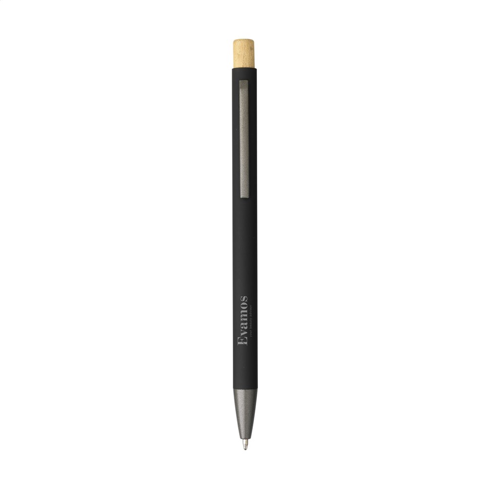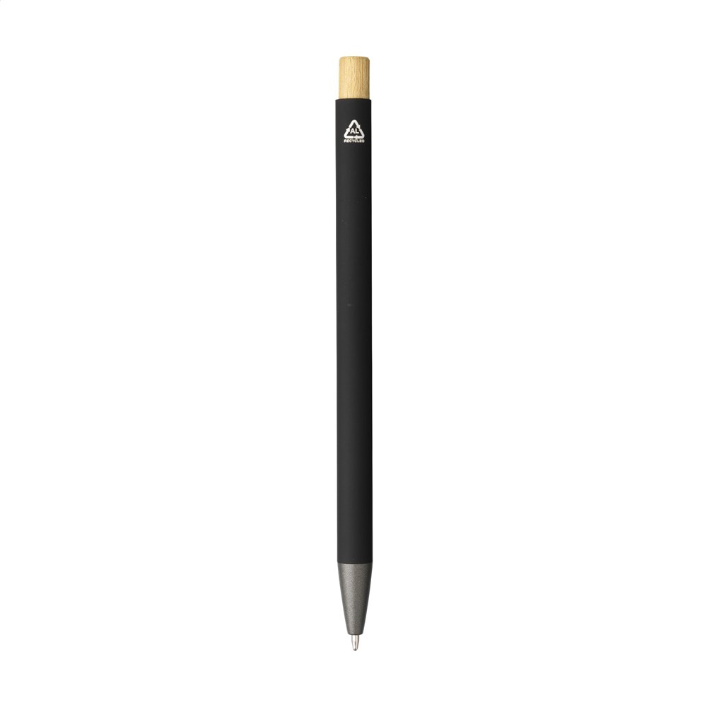 Blauschreibender, schlanker Kugelschreiber mit einem Gehäuse aus 100% recyceltem Aluminium mit gummierter Oberfläche. Metallclip. Schlankes Design. Der Bambus-Druckknopf verleiht dem Stift eine natürlicher Akzent. GRS-zertifiziert. Durch die Verwendung von recyceltem Aluminium kommt eine geringere Menge an neuen Rohstoffen zum Einsatz. Das bedeutet weniger Energieverbrauch und weniger Wasserverbrauch.
