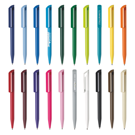 Dieser moderne, stilvolle Kugelschreiber mit Drehmechanik und auffälligem Clip wird dank seiner überzeugenden Optik die Wirkung Ihrer Werbebotschaft noch besonders verstärken. Er ist lieferbar in 20 soliden Farben, die bereits ab 2.000 Stück in Ober- und Unterteil miteinander kombinierbar sind. Er ist ausgestattet mit einer blauschreibenden Großraummine.